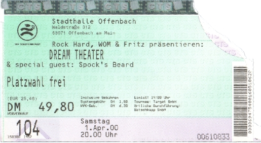 Dream Theater (2000) Dream Theater, Spock's Beard No Responses » Apr 012000 Support: Spock’s Beard 01.04.2000 Offenbach (DE), Stadthalle